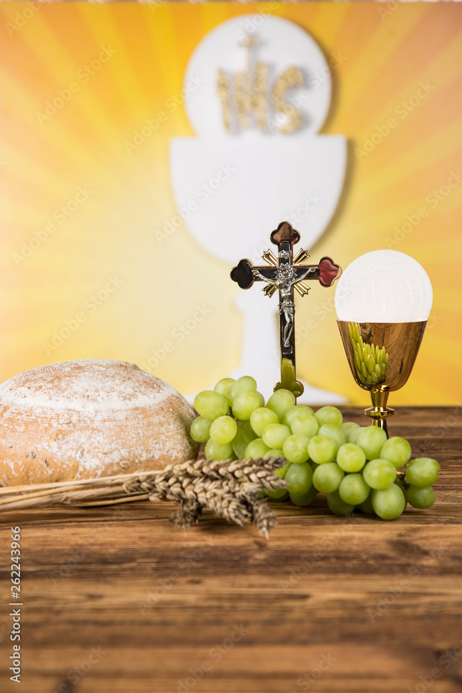 Holy communion a golden chalice with grapes and bread wafers