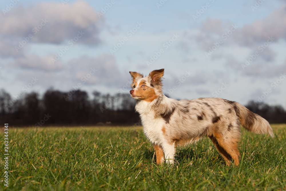 Hund Mini Australian Shepherd Welpe auf einer Wiese