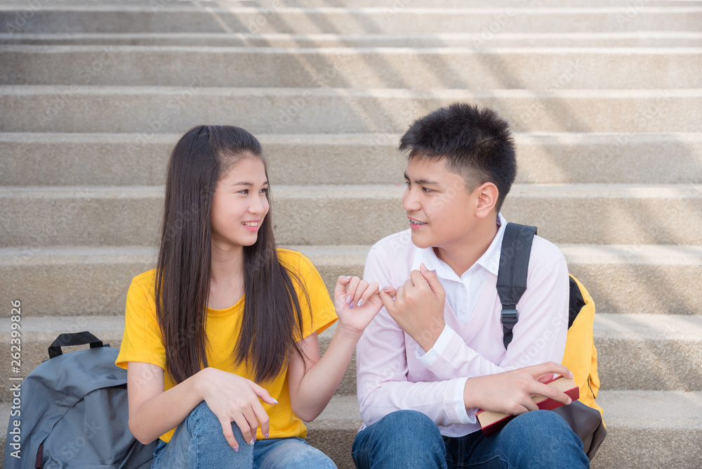 Asian Teenager boy and girl making a pinkie promise,hands making promise as a friendship concept.