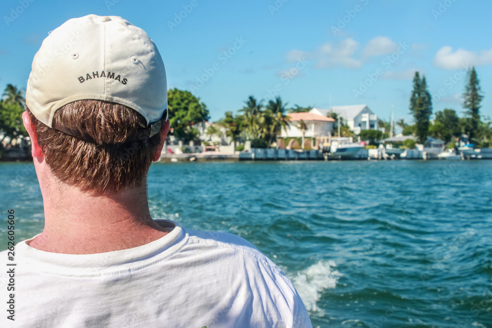Back of man's head wearing ball cap with Bahamas embroidered on it as he looks toward shore from a boat - He is in focus but the background and water are blurred