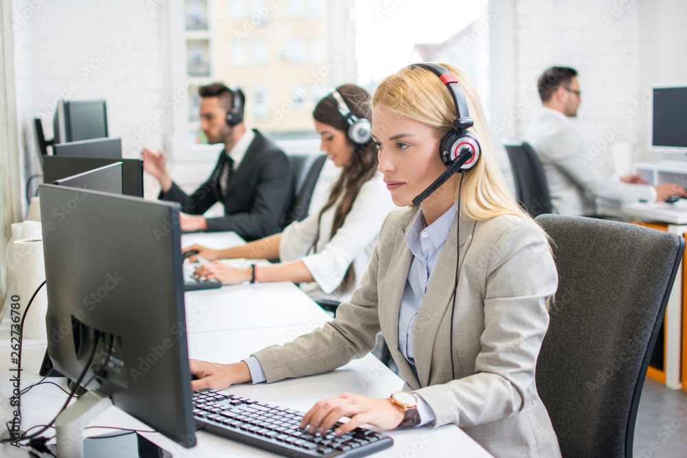 Female secretary with headphones and microphone solving client's problem while working on computer in customer support center.