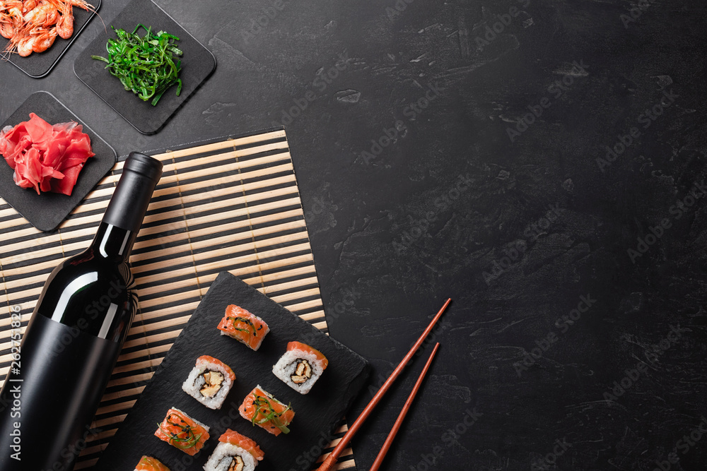 Set of sushi and maki with a bottle of wine on stone table. Top view