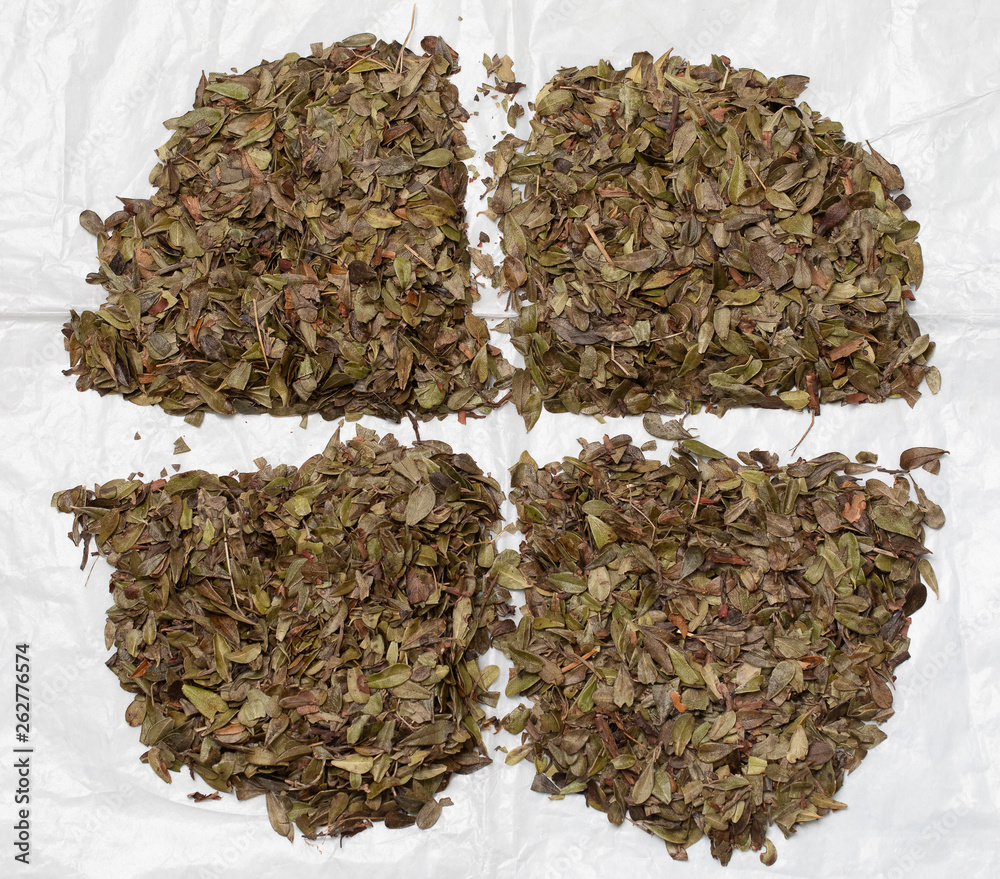 Top view of four piles of Bearberry (Arctostaphylos uva-ursi) leaves creating a cross shape, the dried leaves are commonly used in drinking tea and are believed help cure many ailments.