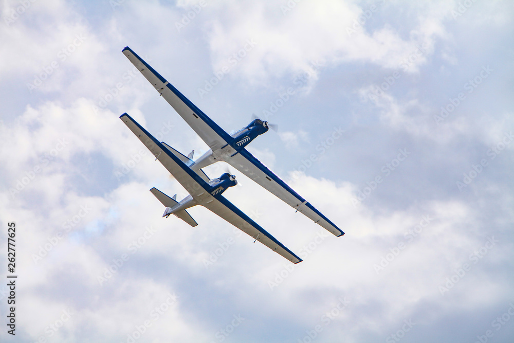 A view of two stunt planes flying overhead in close formation with one aircraft flying directly above the other. Precision and skill concept.