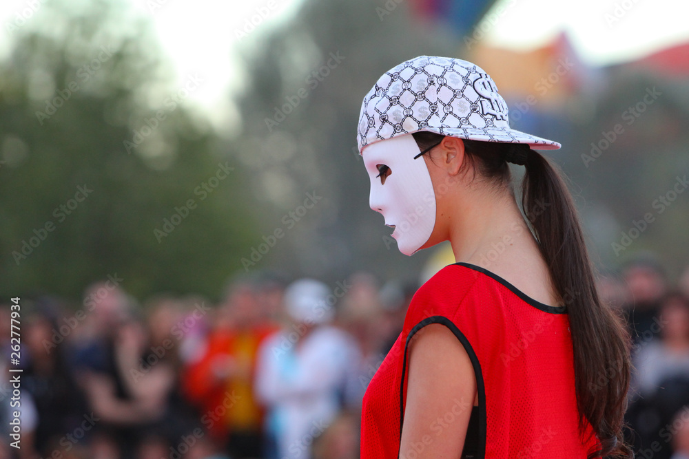 A side profile view of a young female Caucasian dancer wearing a white mask at an outside event.