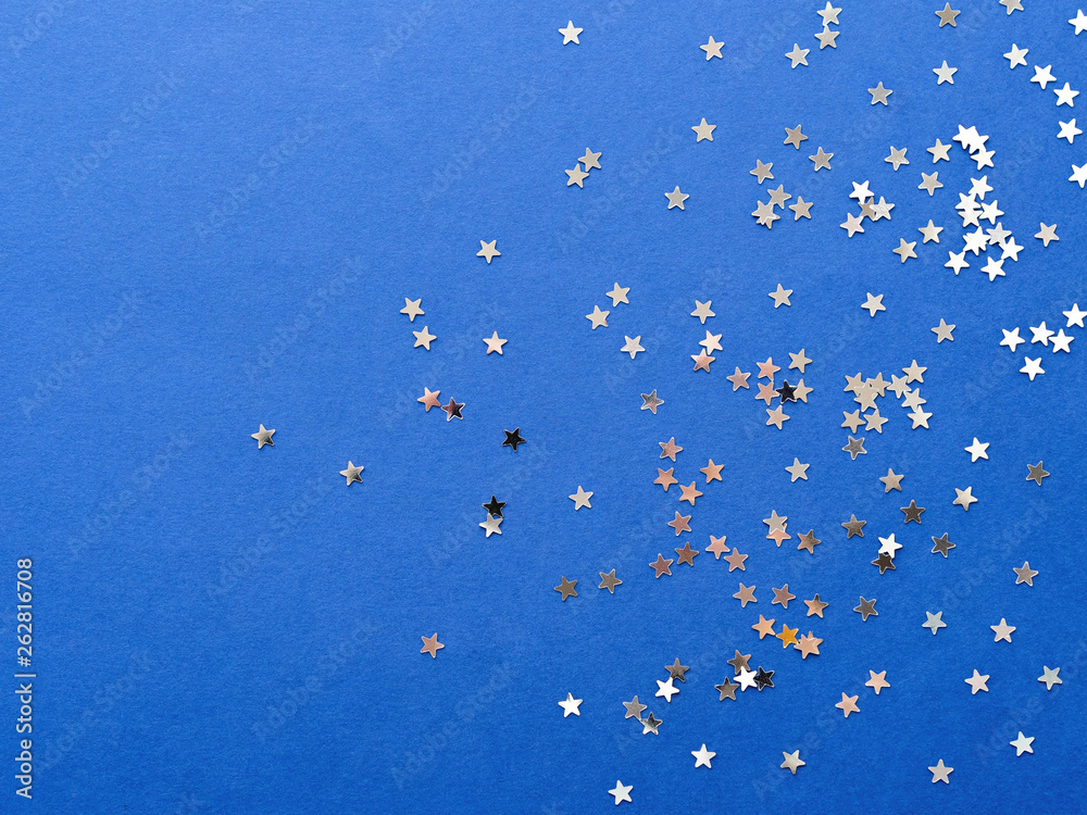 Holiday background with silver star confetti on blue background. Good backdrop for Christmas and New Year cards.