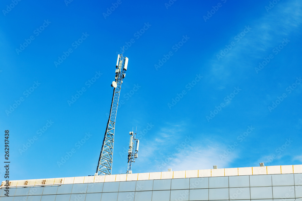 The cell tower with 3G, 4G and 5G communications. Base station for operating mobile phones, receiving and sending a signal. Antenna for wireless communication. Cellular systems in the city.