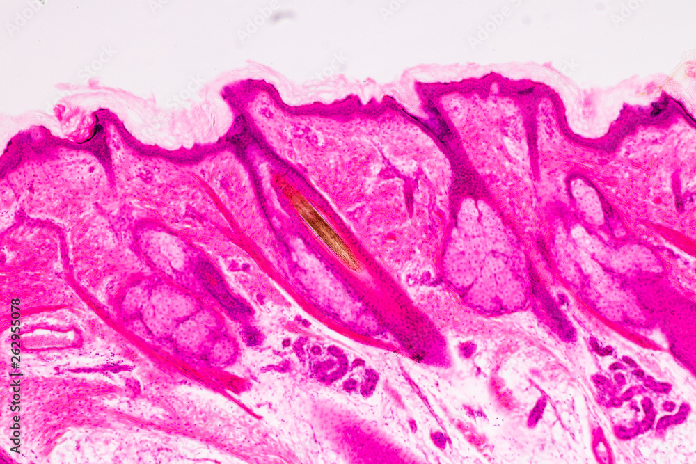 Education anatomy and physiology of Human scalp show of hair folticles under the microscopic in laboratory.