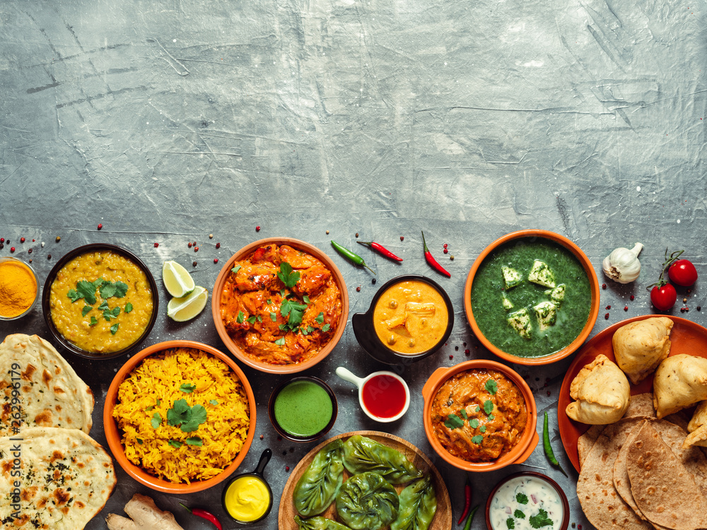 Indian cuisine dishes: tikka masala, dal, paneer, samosa, chapati, chutney, spices. Indian food on gray background. Assortment indian meal with copy space for text. Top view or flat lay.