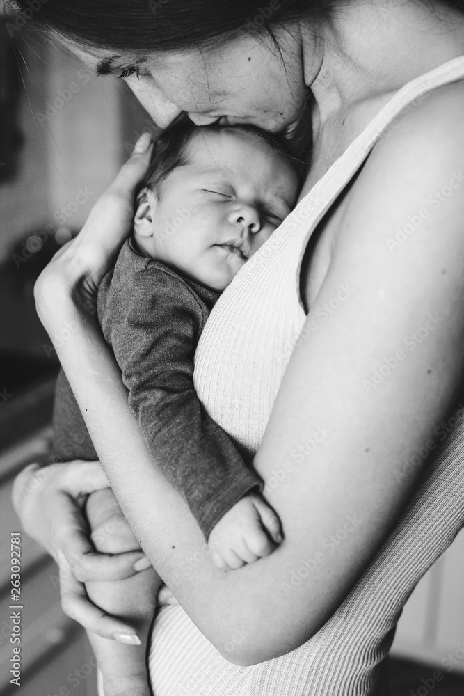 Young mother, holding tenderly her newborn baby girl, close portrait