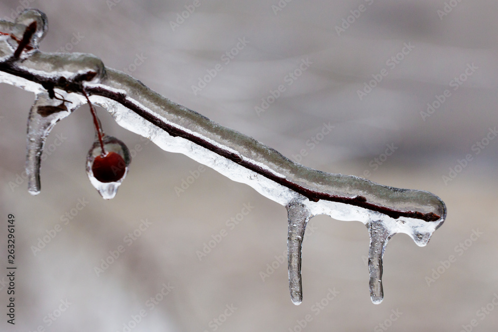 Freezing rain, thick layer of glaze ice on trees branches in Montreal, Canada, 10 April 2019