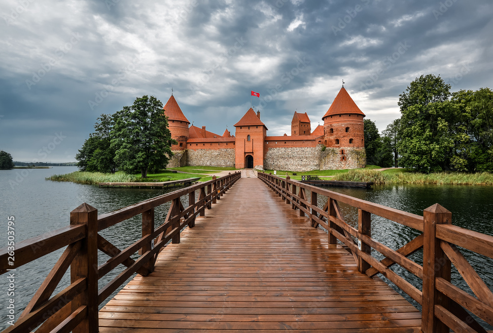 Landscape of Trakai Island Castle, lake and wooden bridge, Lithuania. Trakai Island Castle and bright blue dramatic sky with clouds.