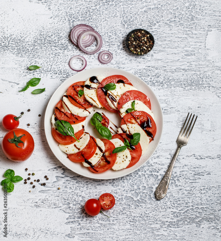 Italian caprese salad with ripe tomatoes, fresh basil and mozzarella cheese on grey stone background. Italian caprese salad in white plate with sliced tomatoes
