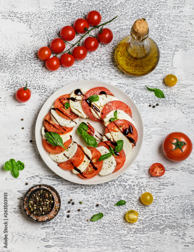 Italian caprese salad with ripe tomatoes, fresh basil and mozzarella cheese on grey stone background. Italian caprese salad in white plate with sliced tomatoes