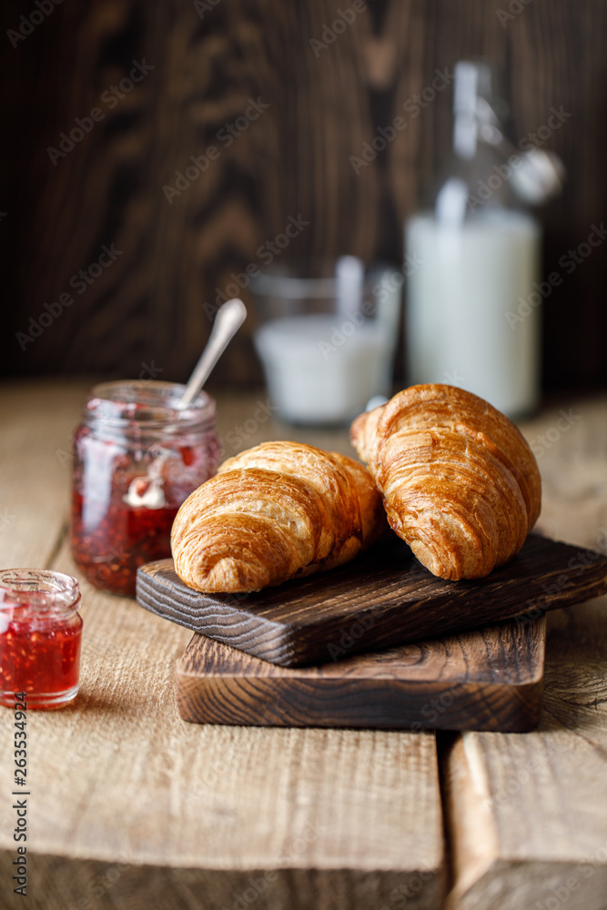 Freshly baked croissants on wooden rustic background. Tasty croissants with copy space