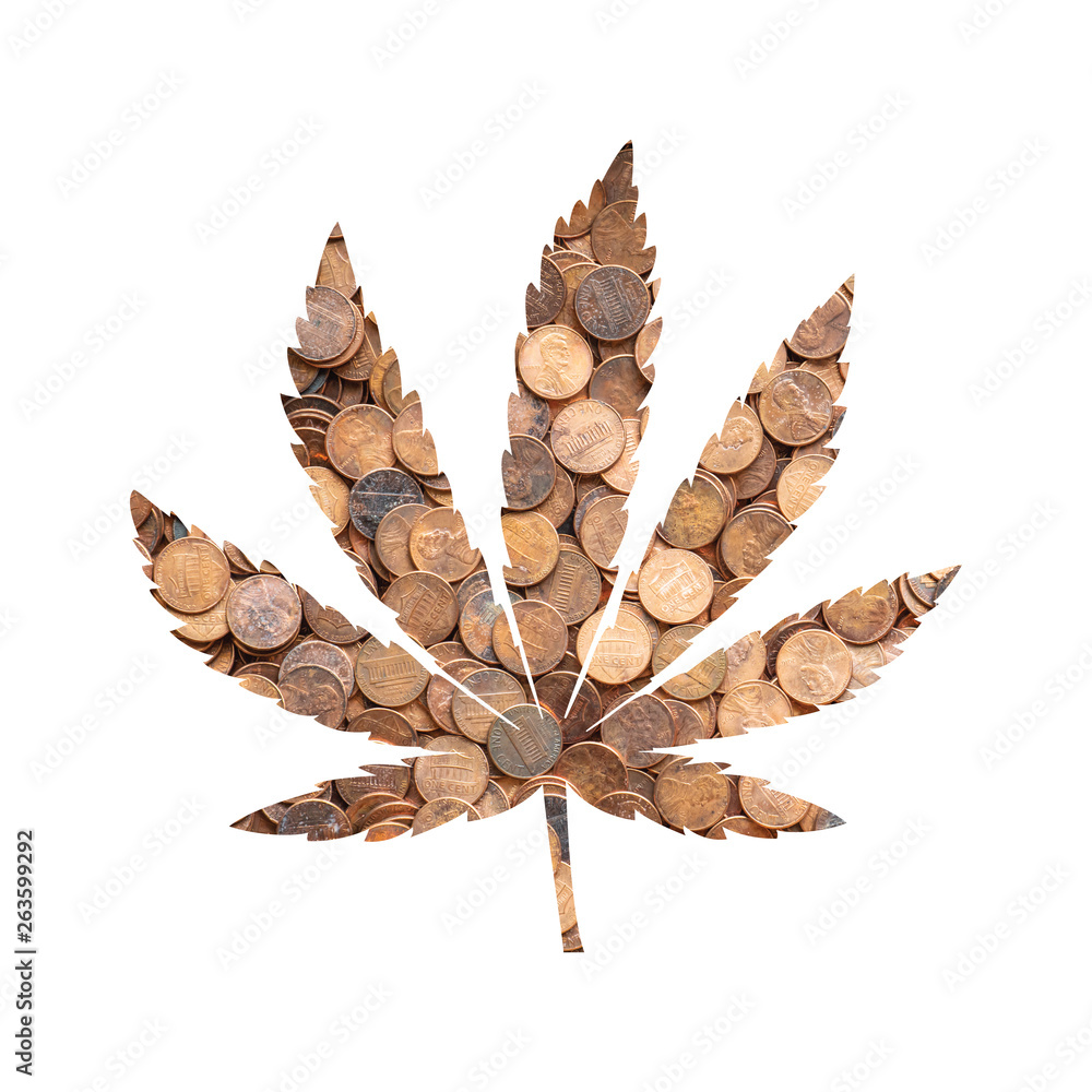 Marijuana Leaf and Pile of Coins, Money, Pennies