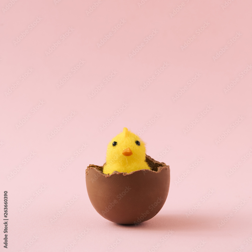 Chick hatched out of chocolate Easter egg on pastel pink background. Minimal holiday concept.