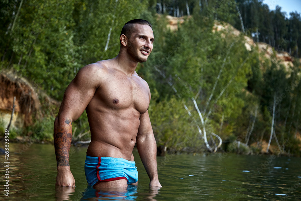 Brutal pumped guy in sexy swimming trunks stands smiling in the lake