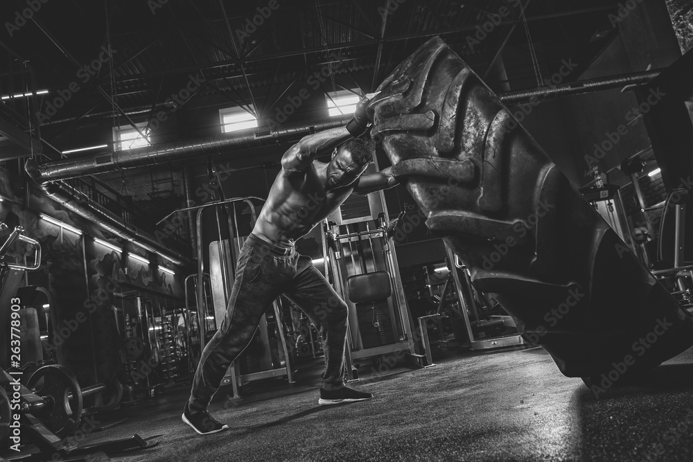 Muscular man working out in gym flipping tire, strong male naked torso abs