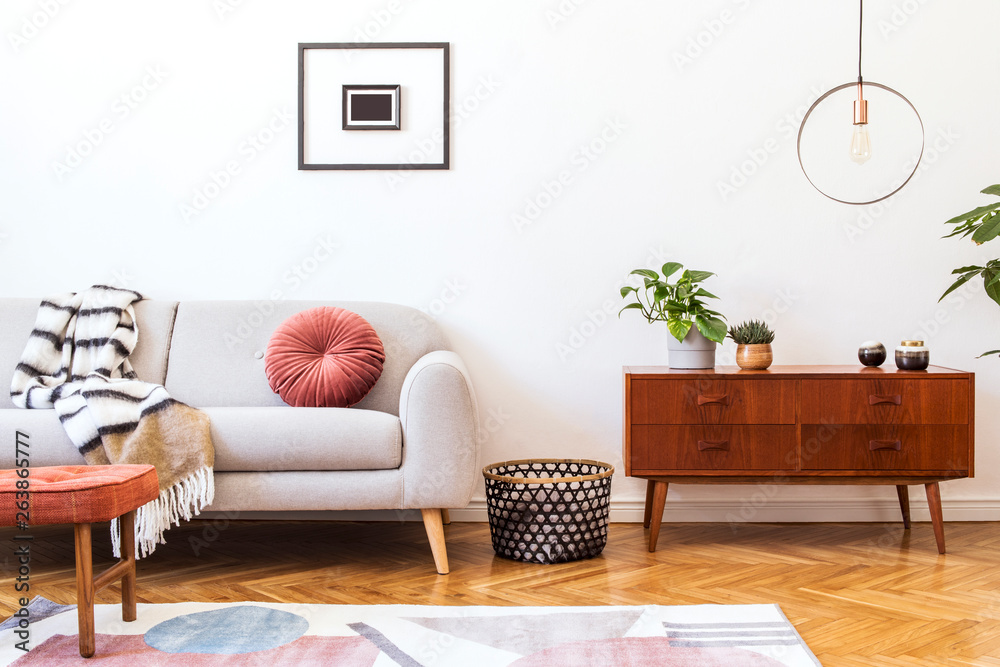 Stylish and retro interior of living room with design commode, gray sofa, round pendant lamp, vintage footrest, elegant accessories and mock up photo frames. Minimalistic home decor with plants.