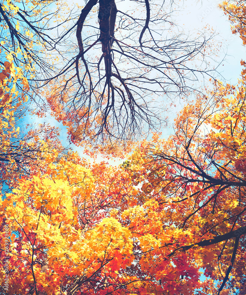 Beautiful colorful orange yellow and red autumn foliage of maple trees in a sunny day on the nature of looking up against blue sky.