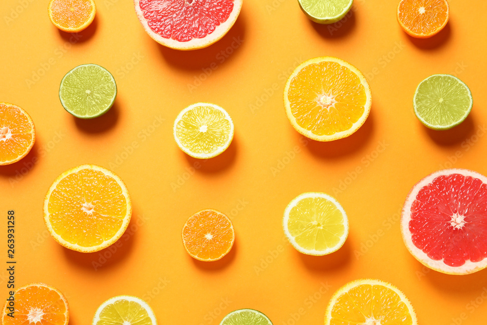 Different citrus fruits on color background, flat lay