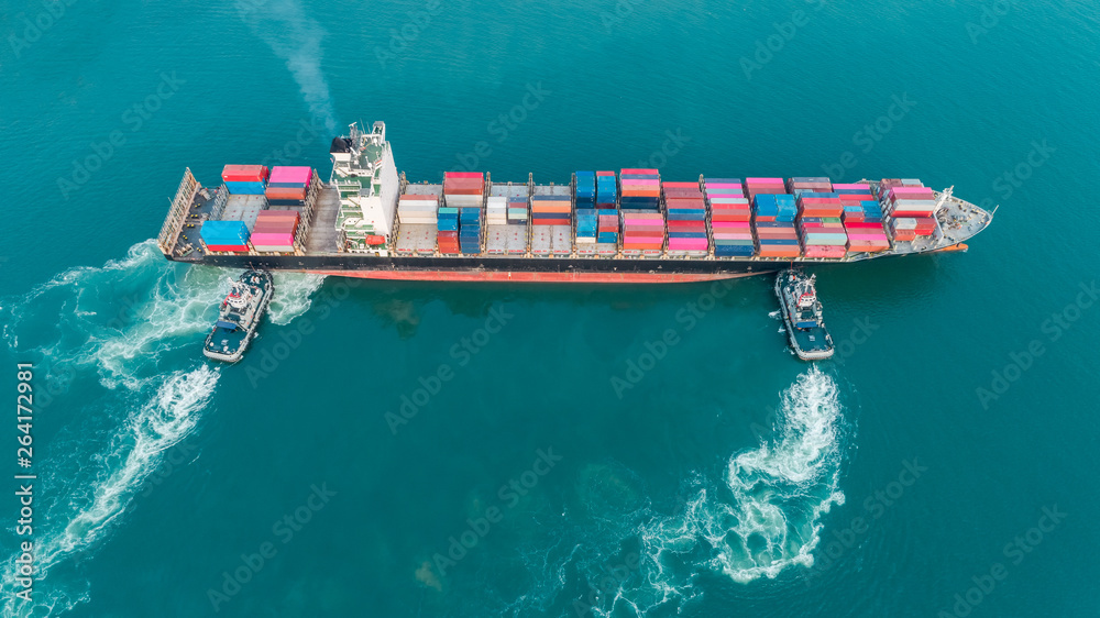 Aerial top view tug boat drag container ship to sea port for logistics, import export, shipping or transportation.