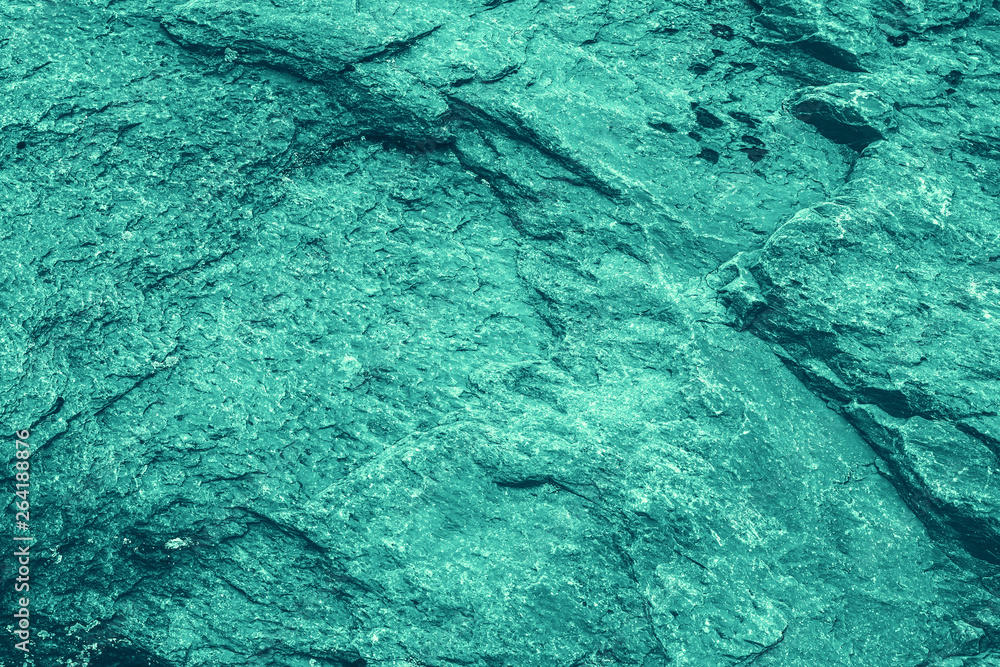 Vintage azure background. Rough painted wall of turquoise color. Imperfect plane of cyan colored. Uneven old decorative toned backdrop of aqzure tint. Texture of teal hue. Ornamental stony surface.
