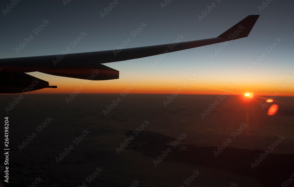 Panorámica con ala de avión y puesta de sol sobrevolando una isla