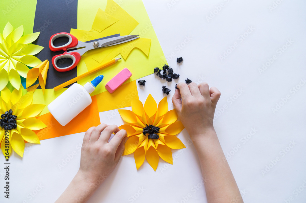 hands of the child makes an odd flower paper out of sunflower. Yellow plant summer. The creative process.