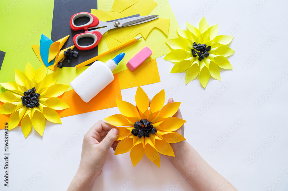 hands of the child makes an odd flower paper out of sunflower. Yellow plant summer. The creative process.