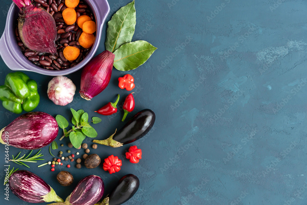 Healthy vegan cooking ingredients, fresh vegetables, clean eating concept, top view with copy space
