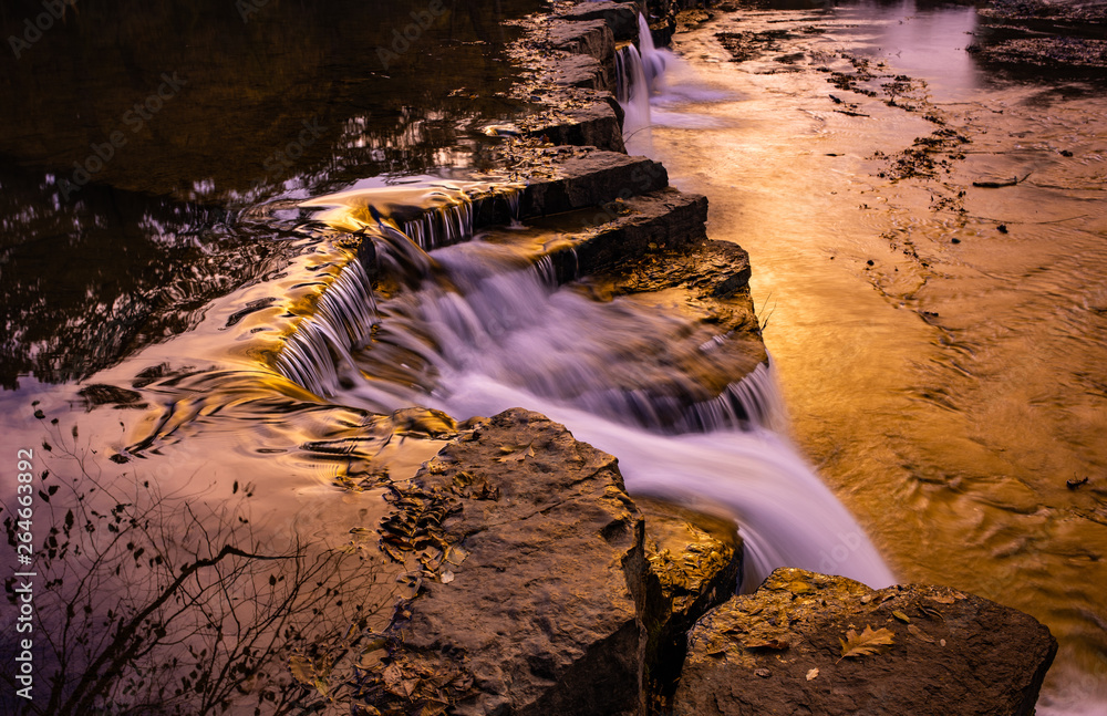 A golden waterfall cascades flows over a rock cliff ledge in Arkansas