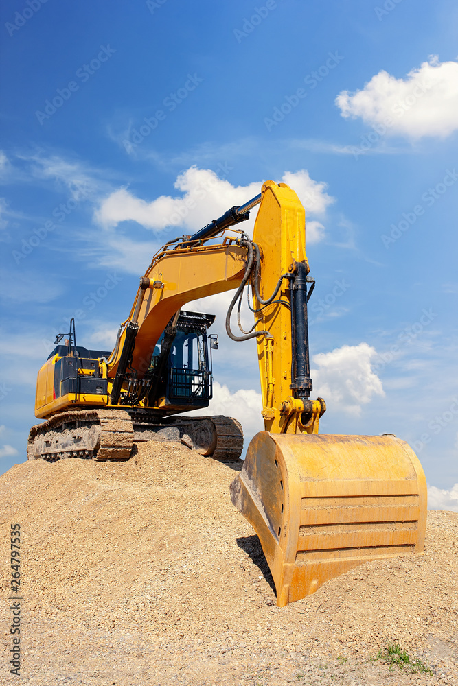 Yellow excavator on a pile of dirt with blue sky with white clouds in the background