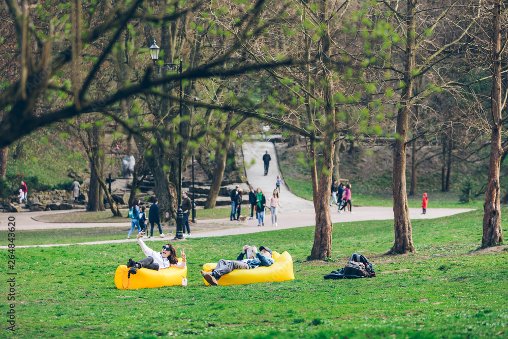 couple laying on yellow inflatable mattress in city park. reading book. taking selfie