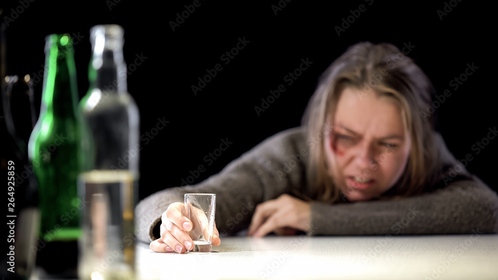 Bruised woman looking with disgust at empty glass, harmful habits, alcoholism