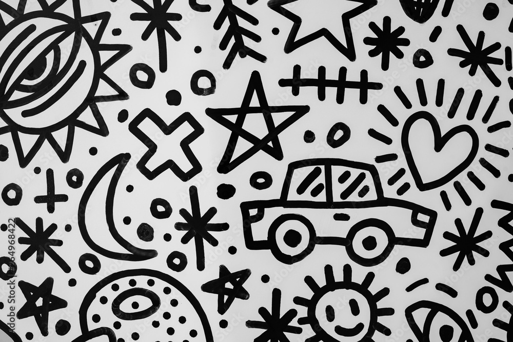 Pattern with car and travel theme, black marker on white background