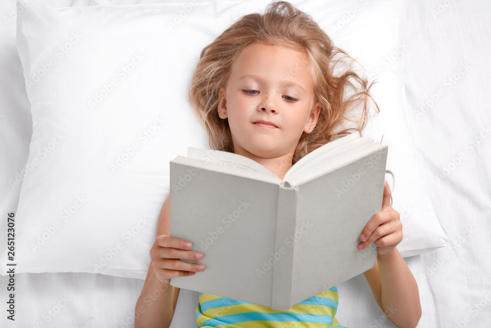 Pretty small preschooler reads attentively interesting story, holds opened book, lies in bed, enjoyes reading before sleep, has good rest. Clever little girl reads fairy tale. Hobby, children concept