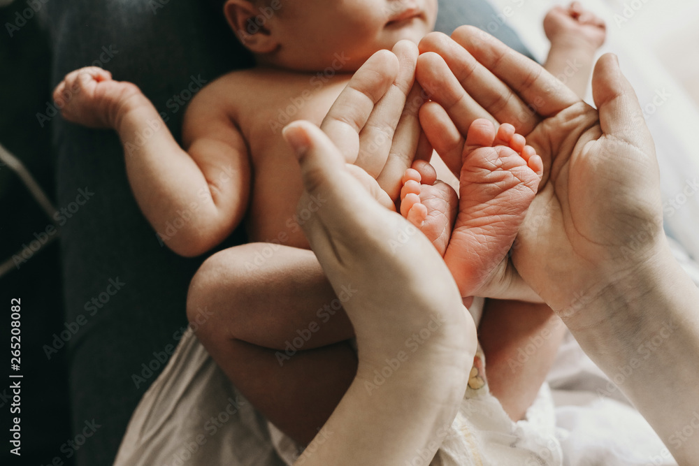 legs of a newborn baby in the arms of his mother