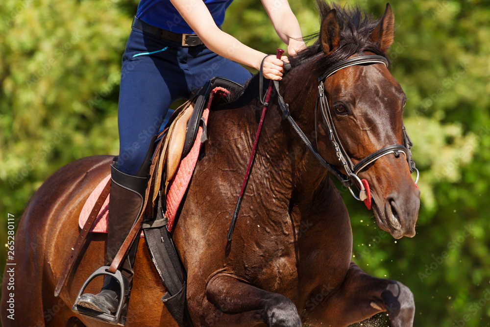 Close-up picture of running bay horse with rider