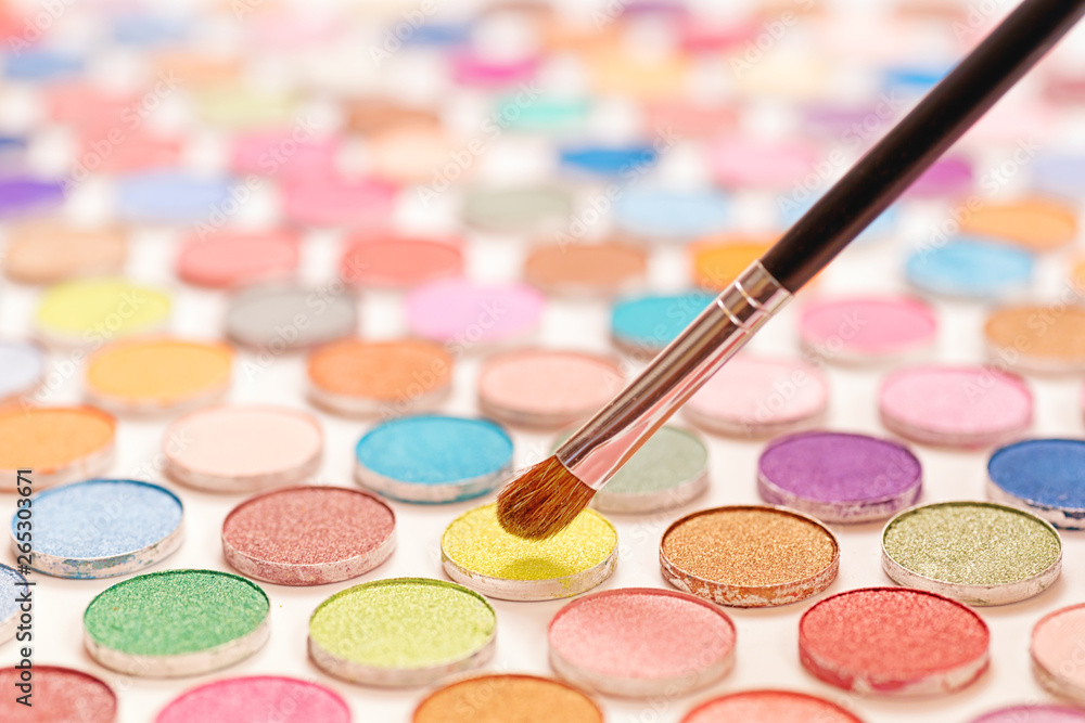 Cosmetic brushes over colored eye shadows with selective focus