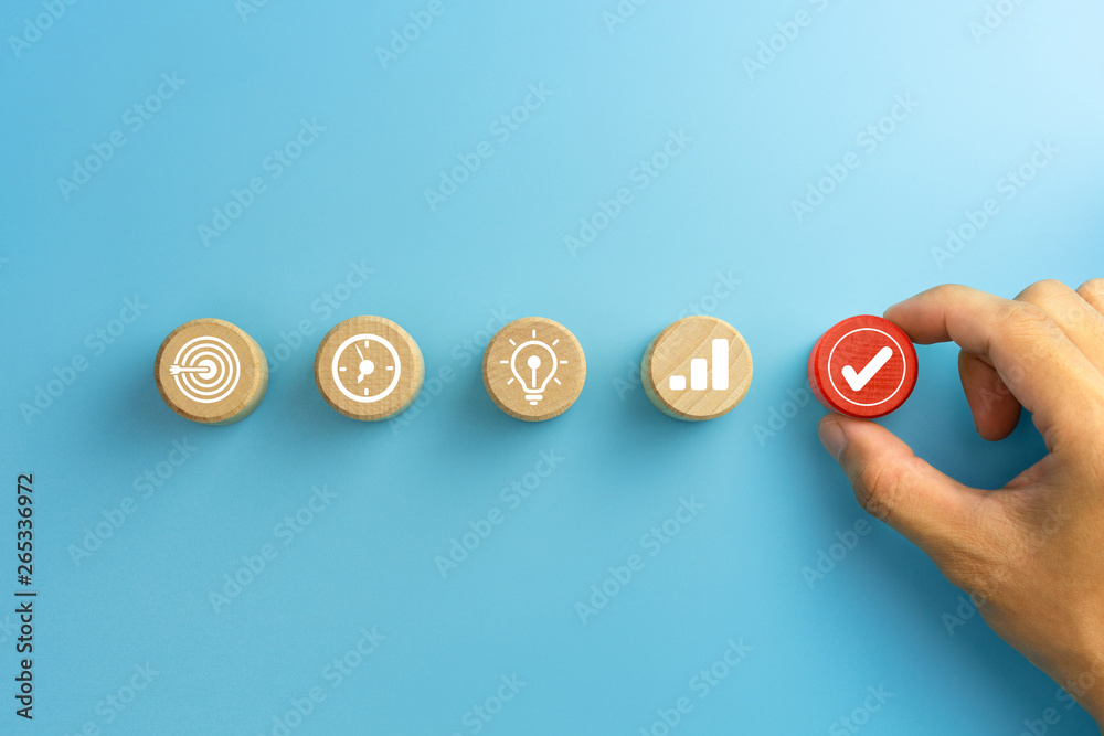 Business process management, Businessman plan a project with wooden cubes with icon business strategy on blue background. copy space