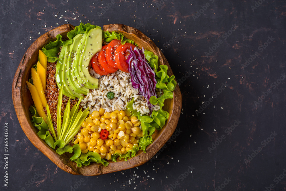 Buddha bowl with chickpea, avocado, wild rice, quinoa seeds, bell pepper, tomatoes, greens, cabbage, lettuce on shabby dark stone table. Vegetarian super food. Top view with copy space.
