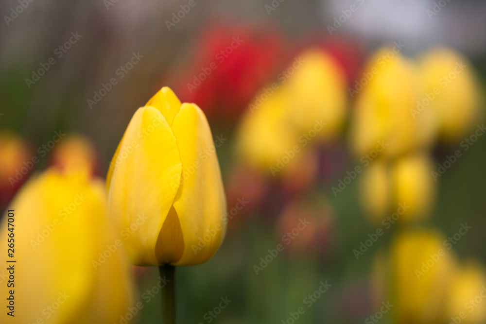 Blooming flowers yellow tulips with greenery blurred tulip field .-Image.