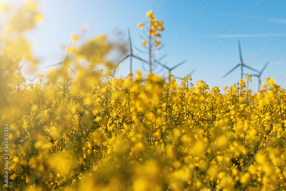 Blühendes Rapsfeld mit Windenergie im Hintergrund