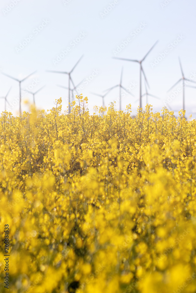Norddeutsche Rapsfelder mit typischer Windenergie (Windräder) im Hintergrund