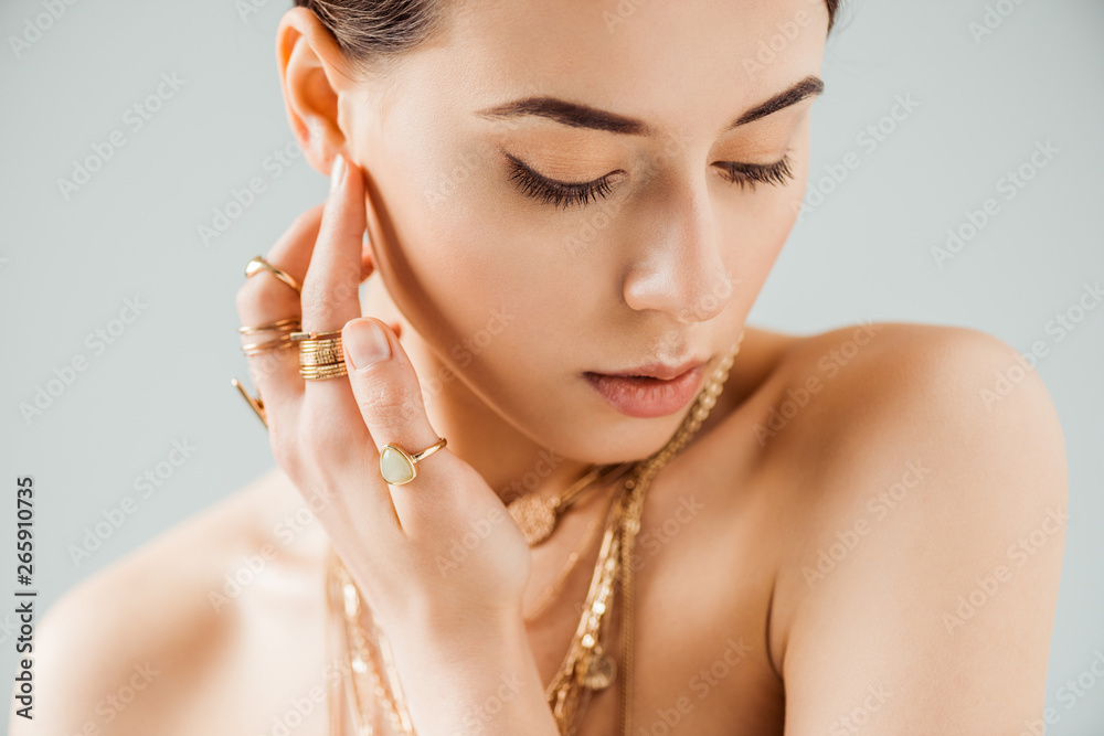 young naked woman with shiny makeup in golden necklaces and rings isolated on grey