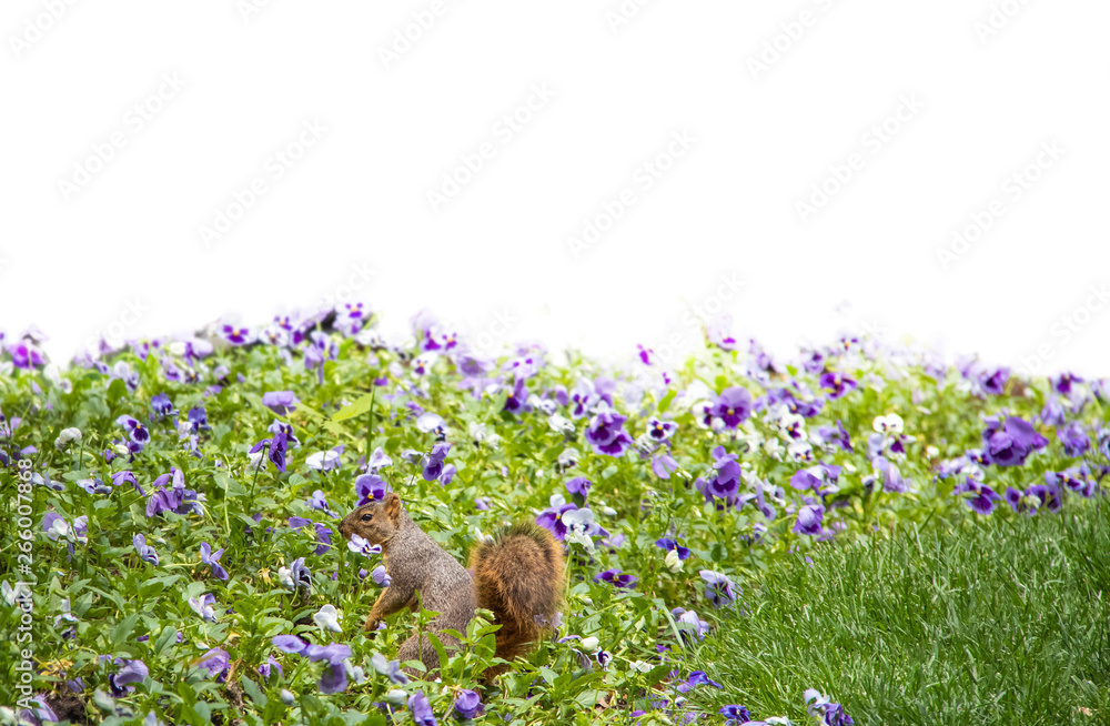 Adorable bright eyed red American squirrel sitting up in a bed of purple violets and green grass fading to white at the top - room for copy