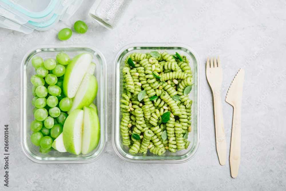 Vegetarian meal prep containers green pesto pasta with basil and pine nuts. Apple and grape for dessert. Top view