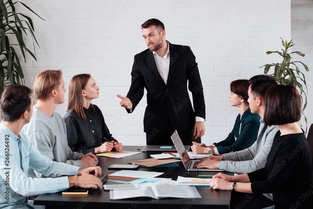 Successful team group business discussing and working with laptop computer. creative business people cin modern workloft. Teamwork concept